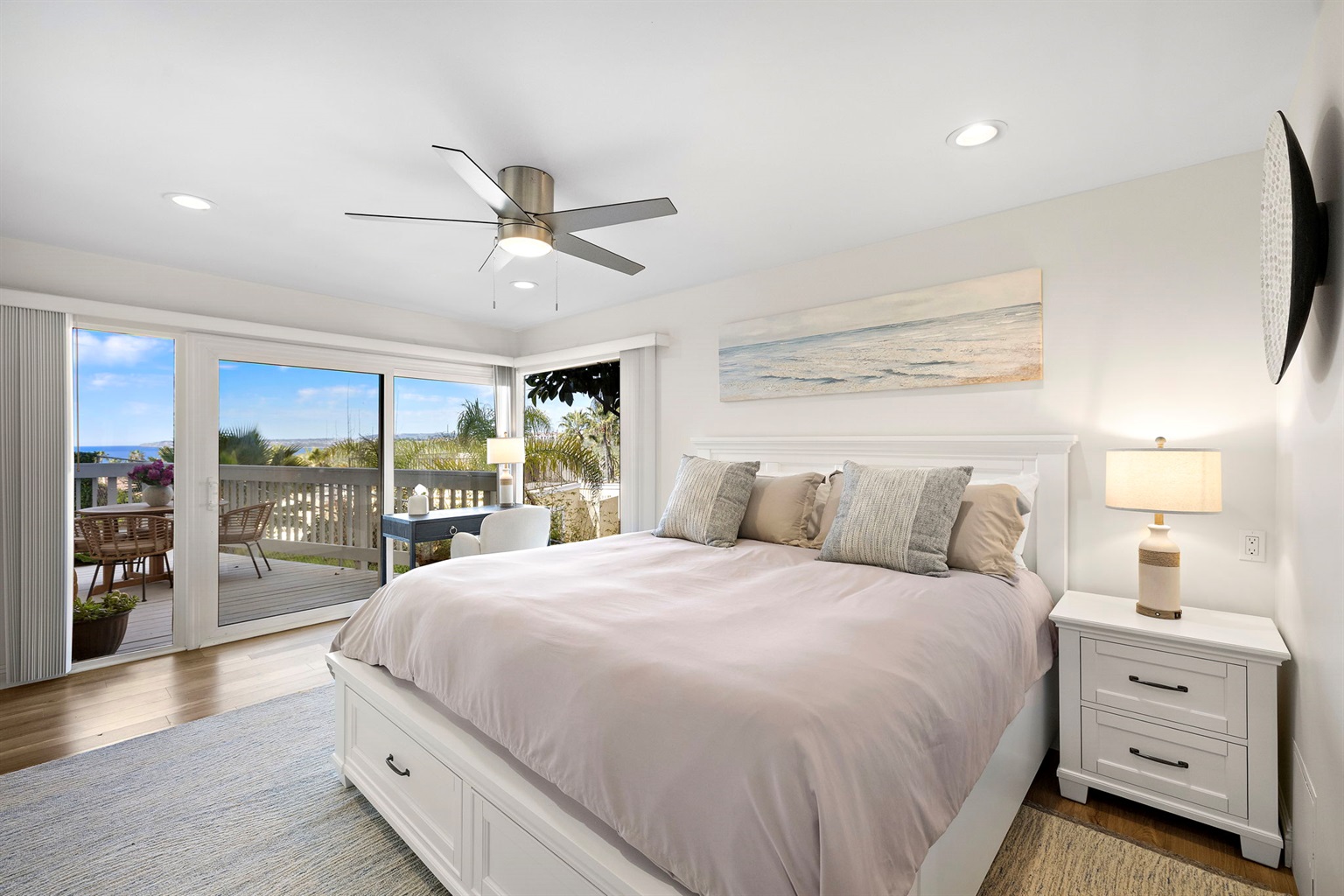 Inside, you’ll find a bright, relaxed coastal atmosphere with luxury mattresses, premium bedding, a fully stocked cook’s kitchen, fast WiFi, large smart TVs, surfboards, wetsuits, and a private garage—rare for the Pier Bowl.