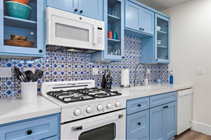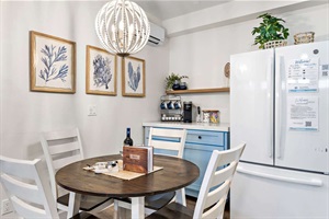 Inside, the condo offers a relaxed beachy atmosphere with all the comforts of home: luxury mattresses and premium bedding, a fully outfitted cook’s kitchen, large smart TVs, music speakers throughout, a queen sofa bed in the living room, plenty of towels, fast WiFi, and access to a secure onsite washer/dryer. A mini-split AC in the common area cools the entire condo when the bedroom door is left open.